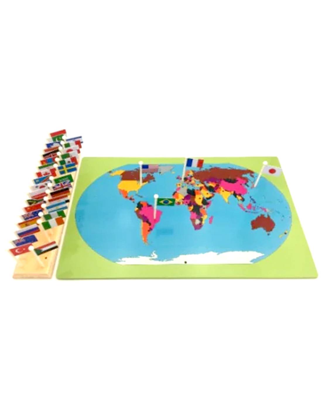 La carte du monde Montessori avec drapeaux est un matériel éducatif ludique pour explorer les pays, leurs drapeaux et leur localisation sur les continents. Elle stimule curiosité, mémoire et repérage spatial dès 5 ans.
