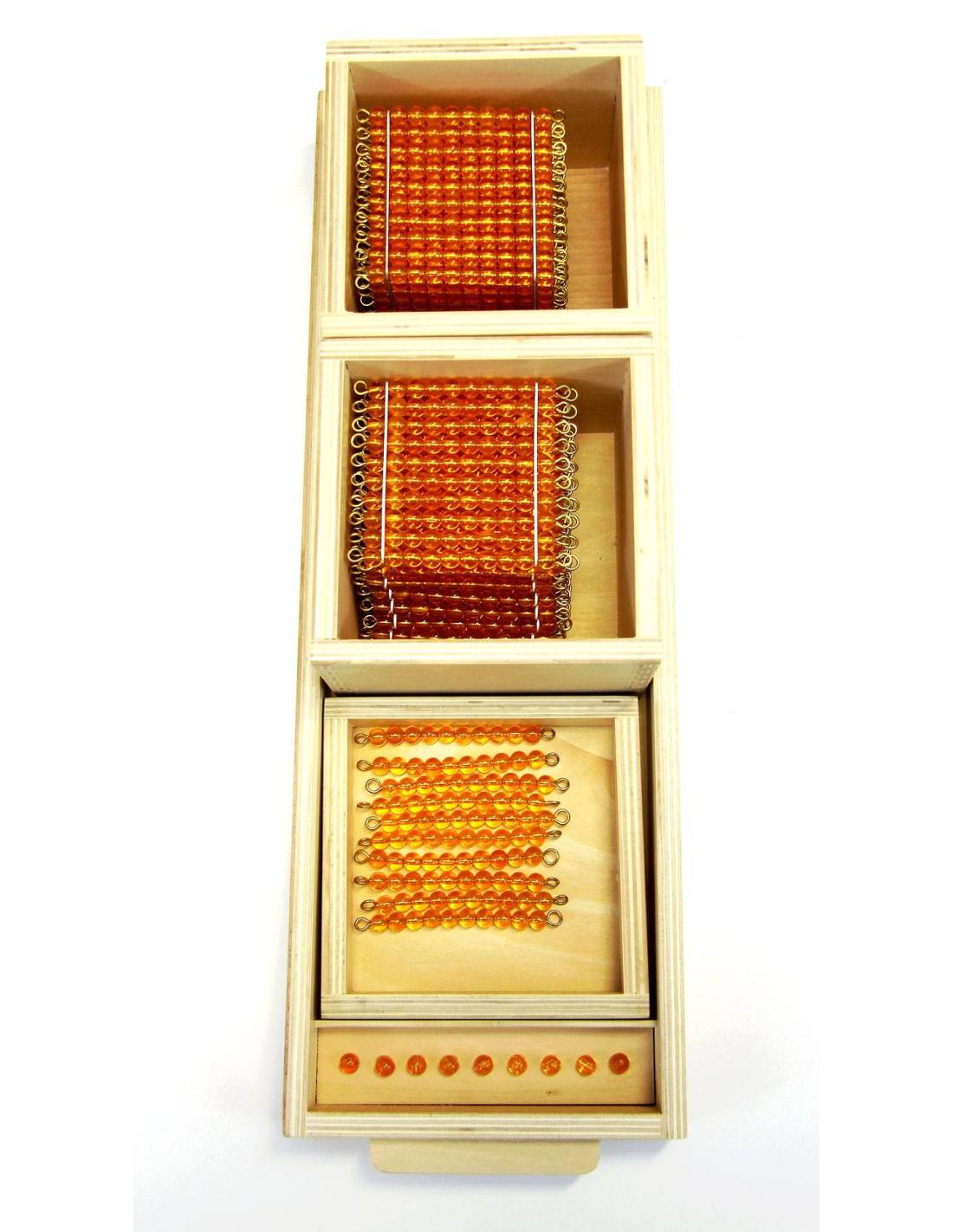 Le deuxième plateau Montessori du système décimal regroupe en un seul outil les quatre ordres de grandeur : unité, dizaine, centaine, millier. Parfait pour renforcer l’abstraction et la visualisation hiérarchique des quantités.