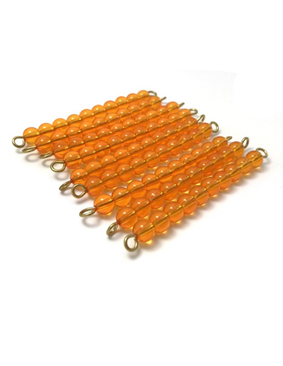 Ce lot de 9 barrettes de perles dorées Montessori représente concrètement les dizaines. Un support essentiel pour les activités autour du système décimal et des premières opérations.