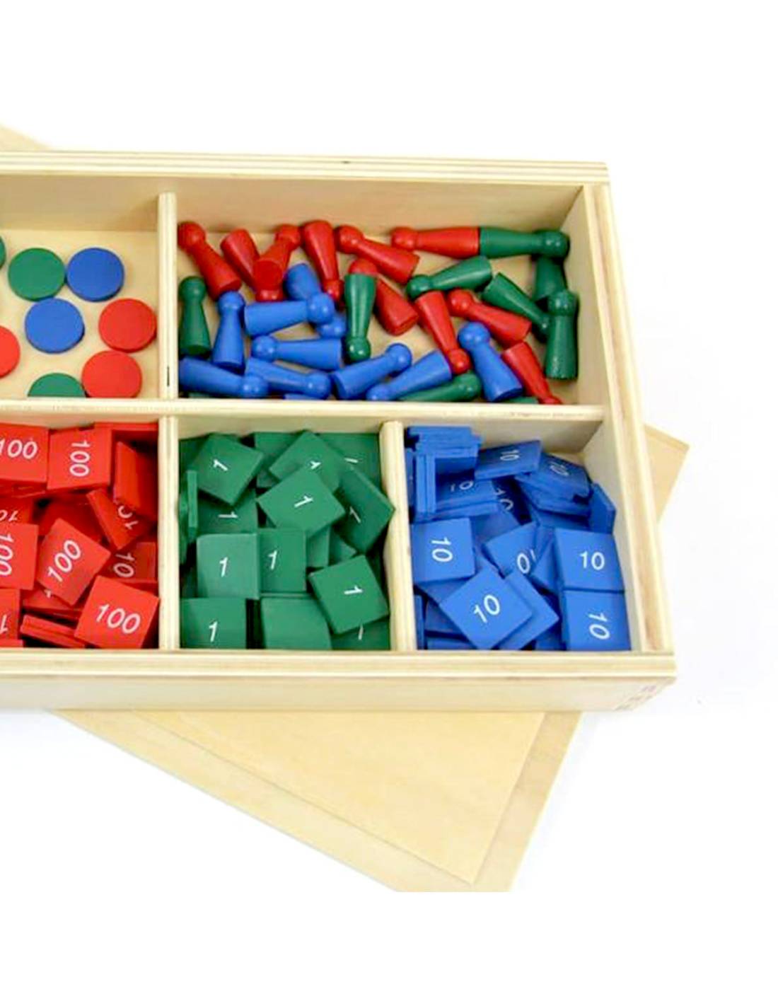 - Jetons en bois codés par couleur (1, 10, 100, 1000)