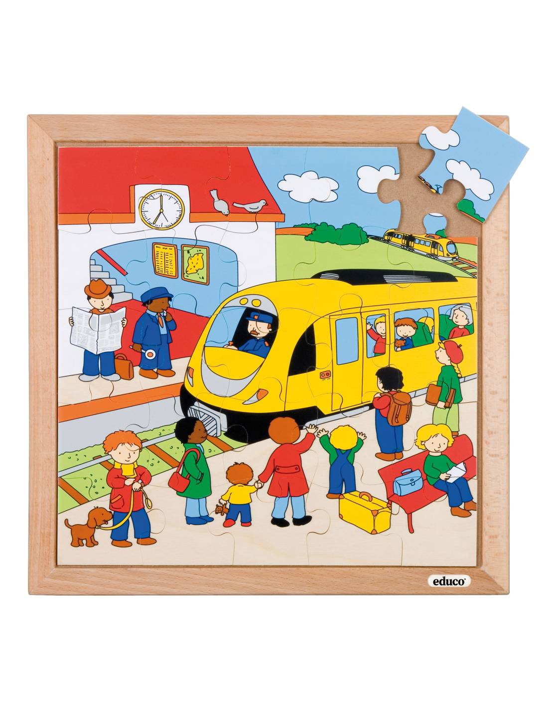 Ce puzzle Le train (25 pièces) en bois illustre une scène détaillée de gare ferroviaire. Il aide les enfants à découvrir le monde des transports, à stimuler leur langage et à renforcer leur motricité fine.