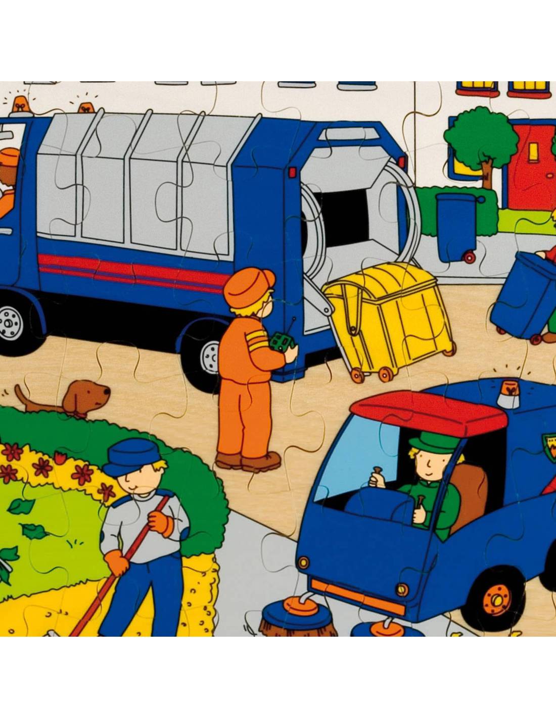 Ce Puzzle Ramassage des déchets (49 pièces) en bois illustre une scène réaliste de collecte des ordures en ville. Il aide les enfants à comprendre l’importance du tri, à enrichir leur vocabulaire et à renforcer leur concentration.