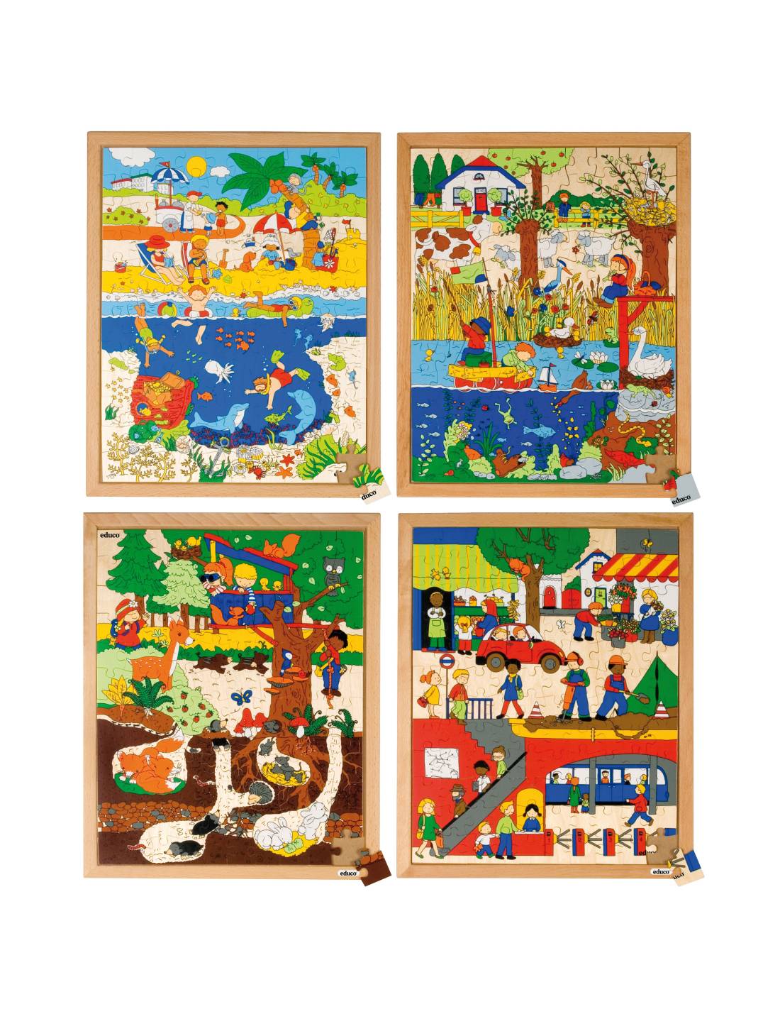 Le coffret Puzzles Dessus et dessous (set de 4) propose 4 puzzles éducatifs de 120 pièces chacun, au format 40 x 50 cm. Chaque scène illustre la vie au-dessus et en dessous d’un environnement naturel ou urbain, stimulant l’observation, le langage et la curiosité scientifique.