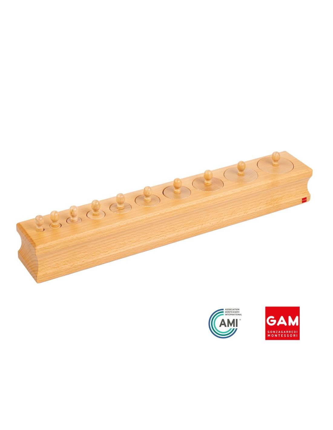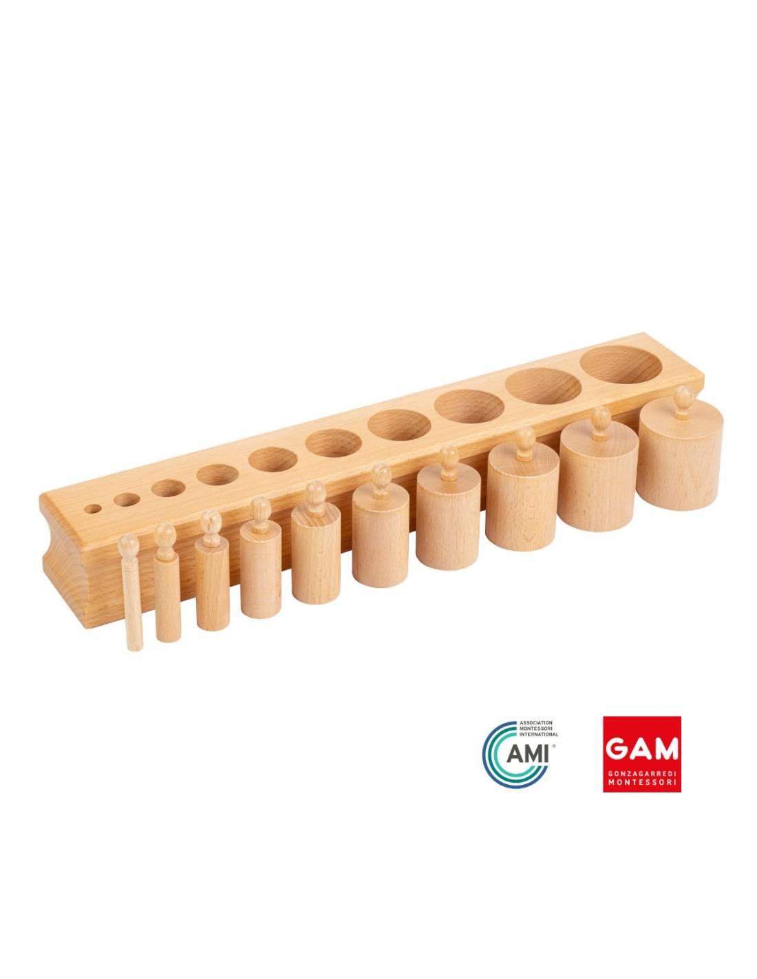 Le bloc est en bois de hêtre massif verni d’une finition satinée. Il comprend 10 cylindres à boutons dont la hauteur reste constante tandis que le diamètre augmente progressivement. Chaque cylindre est poncé et laqué individuellement pour garantir une manipulation fluide et durable. Produit par GAM Montessori (Gonzagarredi), il répond aux normes internationales de qualité du matériel Montessori.