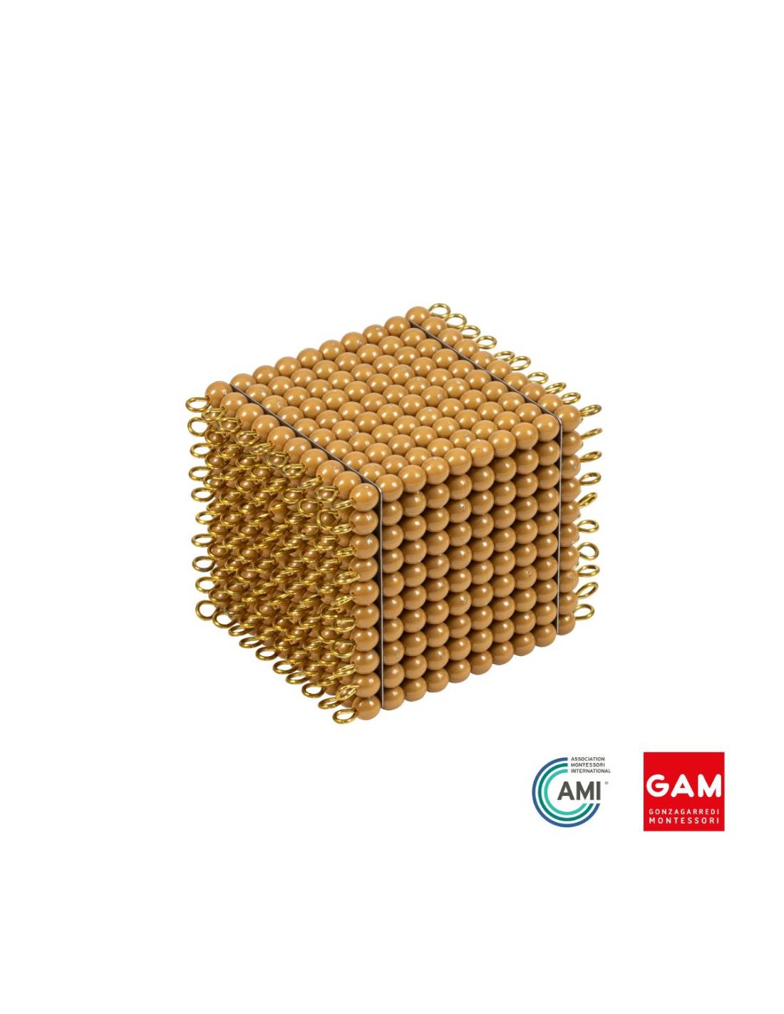 Le cube de perles dorées de 1000 Montessori représente concrètement le millier dans le système décimal. Composé de dix plaques de cent perles assemblées, il permet à l’enfant de visualiser et manipuler une grande quantité de façon tangible.