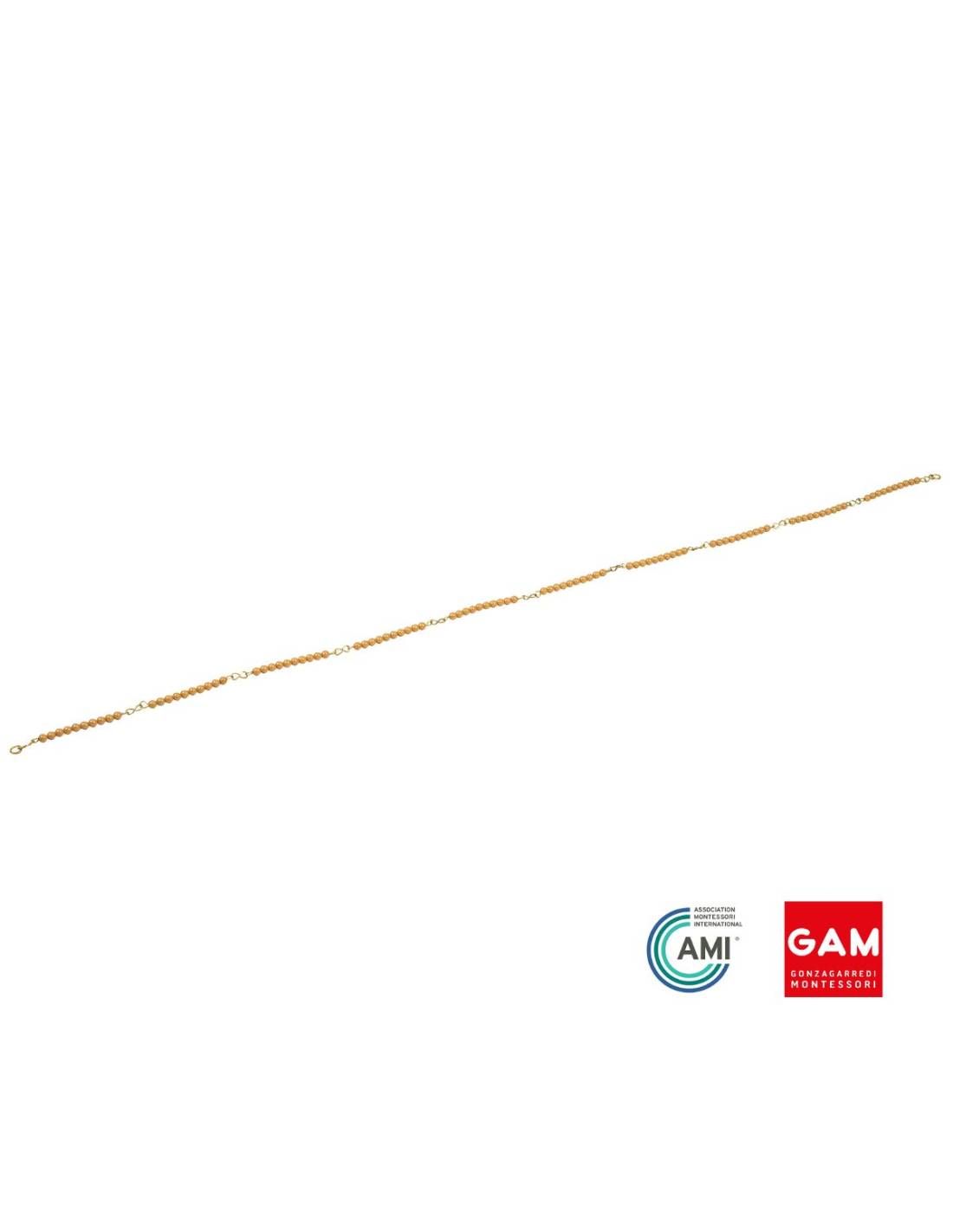 La chaîne de 100 Montessori permet à l’enfant d’explorer concrètement la numération décimale jusqu’à 100. En manipulant les perles dorées, il visualise la quantité, structure sa pensée mathématique et consolide la compréhension du système décimal.
