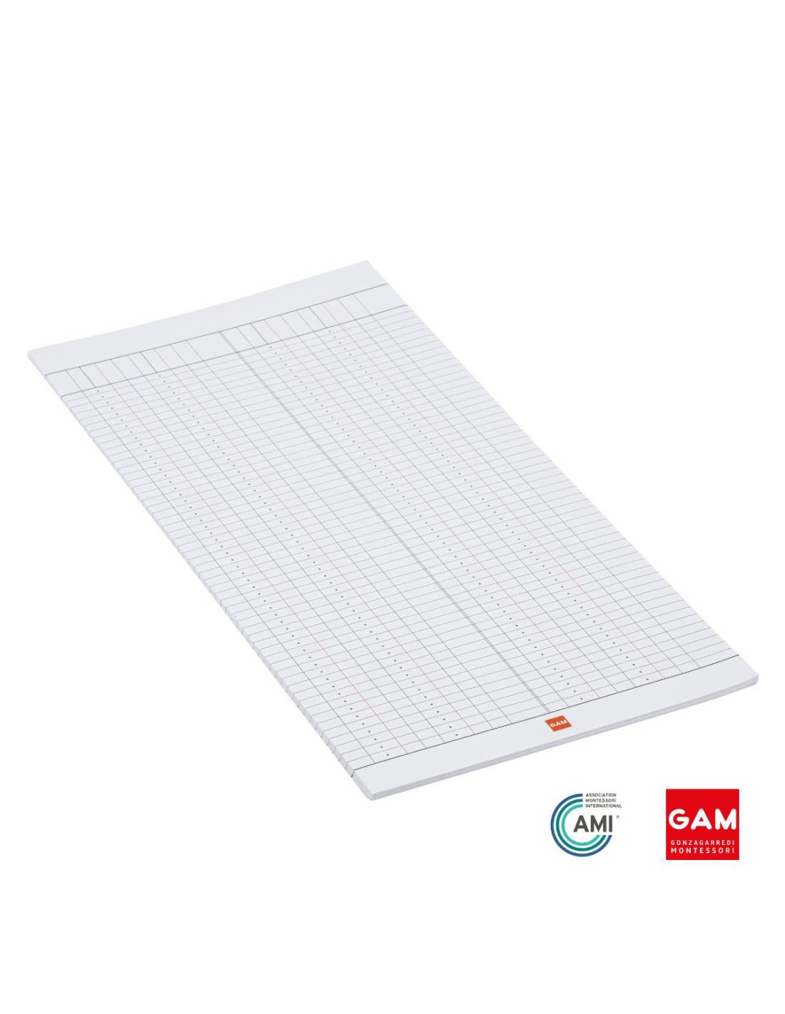 Le lot comprend 500 feuilles au format adapté au grand boulier Montessori. Chaque feuille est imprimée avec une grille précise correspondant à la disposition du matériel. Le papier épais et mat offre un confort d’écriture idéal pour le crayon ou le stylo. Produit par GAM Montessori (Gonzagarredi), ces feuilles garantissent une compatibilité parfaite avec les boulier Montessori standard utilisés dans les classes agréées.
