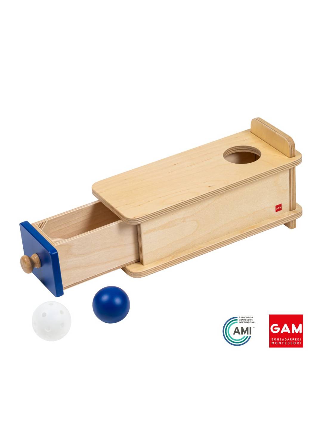 Boite permanence de l'objet avec tiroir et balles - GAM Montessori